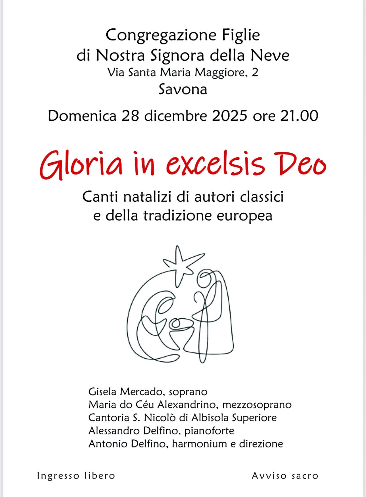 La musica come linguaggio universale capace di unire popoli, culture e cammini di fede. È questo lo spirito di “Gloria in excelsis Deo”, il concerto di canti natalizi che si terrà domenica 28 dicembre 2025 alle ore 21.00, presso la Congregazione Figlie di Nostra Signora della Neve, in via Santa Maria Maggiore 2, a Savona.